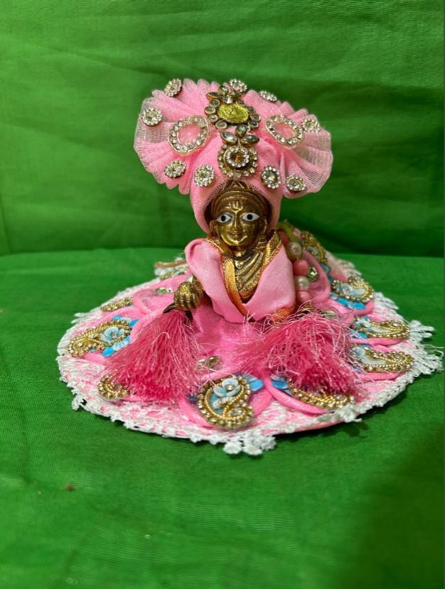 This Bal Gopal vastra is crafted in an elegant pink shade with heavy embroidery, shimmering stones, and golden motifs. The attire includes a decorated dress, a stylish pagdi, and ornamental accessories, reflecting devotion and grace. Adorned with tassels and lace, it enhances the beauty of Laddu Gopal ji, making it ideal for puja, festivals, and daily shringar.