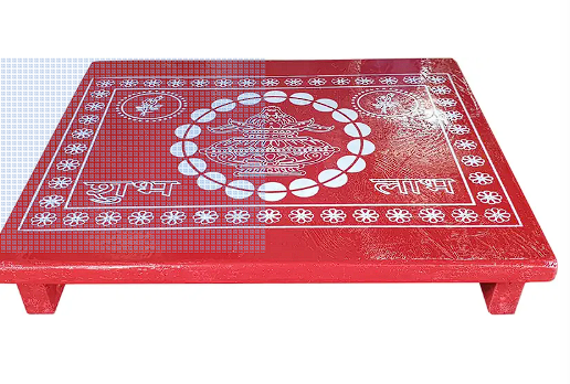 Red Painted Pooja Chowki – a sturdy and elegant wooden platform ideal for placing idols, Kalash, and pooja essentials.